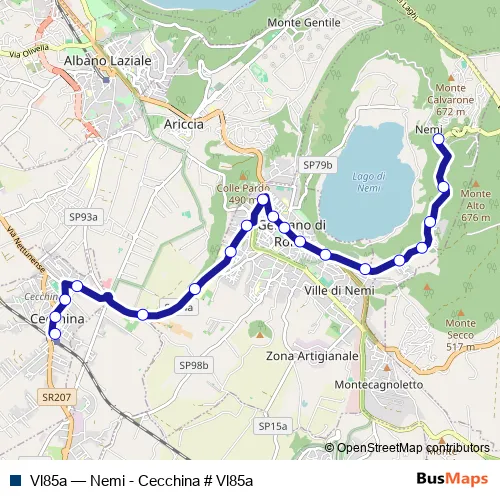 The first stop of the Vl85a bus route is Nemi | Piazza Roma # f13582 and the last stop is Albano | Cecchina FS # f13614. Vl85a (Nemi - Cecchina # Vl85a) is operational during tutti i giorni.