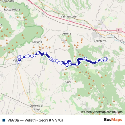 The first stop of the Vl970a bus route is Velletri | Stazione FS # f2818 and the last stop is Segni | Largo Sepe # f13787. Vl970a (Velletri - Segni # Vl970a) is operational during tutti i giorni.