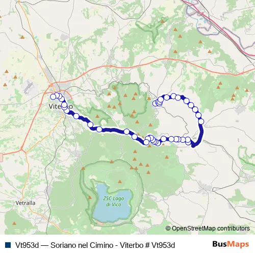 Services on the Vt953d - Soriano nel Cimino - Viterbo # Vt953d bus start at 06:55 on lunedì, martedì, mercoledì, giovedì, venerdì.