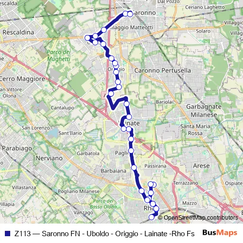 The first stop of the Z113 bus route is RHO p.za Liberta' (FS-Ist. Cannizzaro/Rebora) and the last stop is Saronno p.za I Maggio (Autostazione). Z113 (Saronno FN - Uboldo - Origgio - Lainate -Rho Fs) is operational during tutti i giorni.