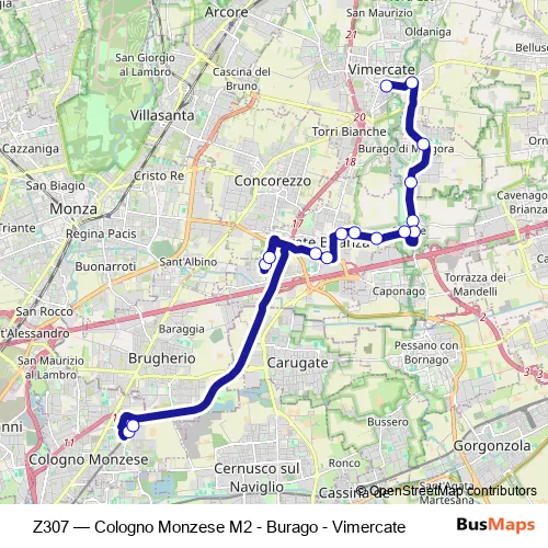 The first stop of the Z307 bus route is Vimercate (Autostazione) and the last stop is Cologno Nord M2. Z307 (Cologno Monzese M2 - Burago - Vimercate) is operational during tutti i giorni.