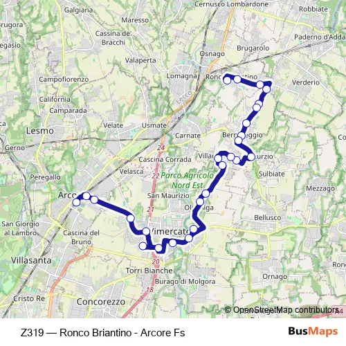 The first stop of the Z319 bus route is Ronco Briantino (V.Mandelli) and the last stop is Arcore (Stazione Fs). Z319 (Ronco Briantino - Arcore Fs) is operational during tutti i giorni.