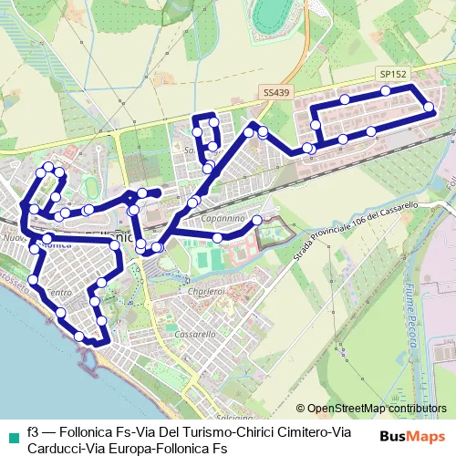 The first stop of the f3 bus route is Follonica Fs and the last stop is Follonica Fs (Arrivo). f3 (Follonica Fs-Via Del Turismo-Chirici Cimitero-Via Carducci-Via Europa-Follonica Fs) is operational during tutti i giorni.