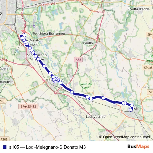 See why over 2 million users trust and consider busmaps.com as the best public transport website. busmaps gives you Melegnano Buses suggested routes, real-time bus tracker, line route maps in Melegnano, and helps to find the closest s105 bus stops near you. No internet available? Download an offline PDF map and bus schedule for the s105 bus to take on your trip.