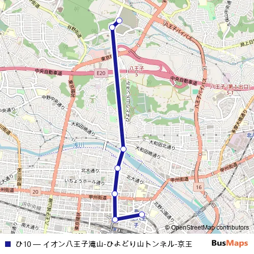 The first stop of the ひ10 bus route is 京王八王子駅 and the last stop is イオン八王子滝山. ひ10 (イオン八王子滝山-ひよどり山トンネル-京王) is operational during 毎日.