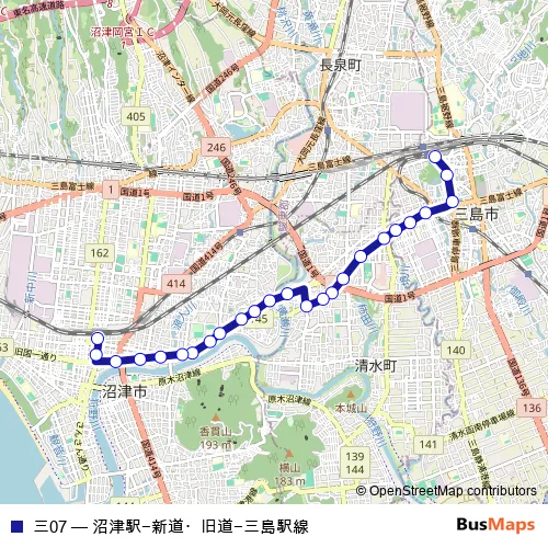 The first stop of the 三07 bus route is 三島駅 and the last stop is 沼津駅. 三07 (沼津駅−新道・旧道−三島駅線) is operational during 毎日.