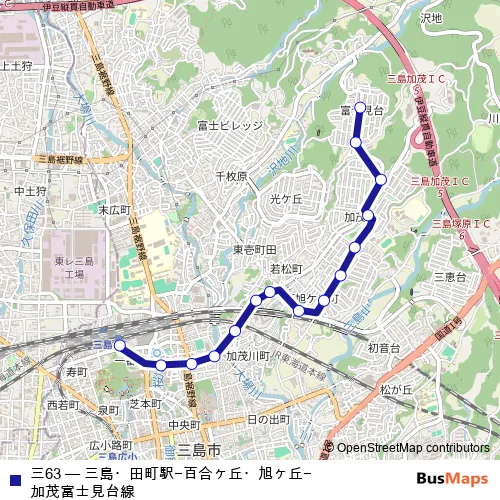 The first stop of the 三63 bus route is 富士見台 and the last stop is 三島駅. 三63 (三島・田町駅−百合ヶ丘・旭ヶ丘−加茂富士見台線) is operational during 毎日.