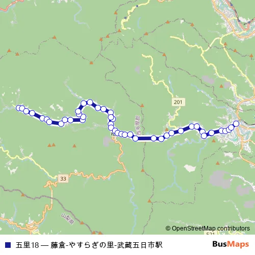 The first stop of the 五里18 bus route is 藤倉 and the last stop is 武蔵五日市駅. 五里18 (藤倉-やすらぎの里-武蔵五日市駅) is operational during 毎日.