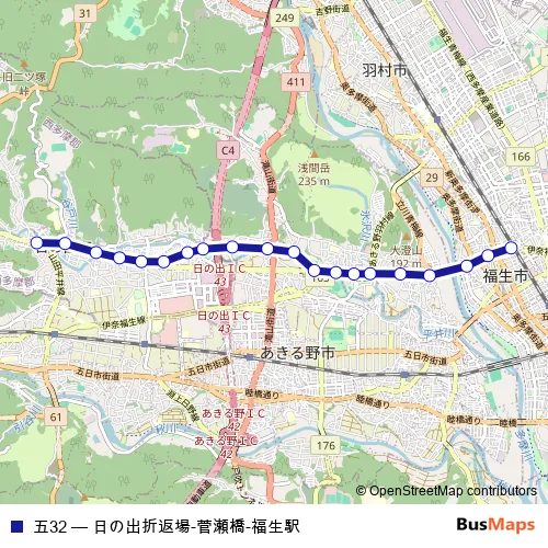 The first stop of the 五32 bus route is 日の出折返場 and the last stop is 福生駅. 五32 (日の出折返場-菅瀬橋-福生駅) is operational during 毎日.