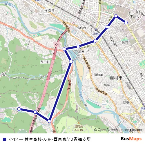 The first stop of the 小12 bus route is 菅生高校 and the last stop is 西東京バス青梅支所. 小12 (菅生高校-友田-西東京バス青梅支所) is operational during 平日.