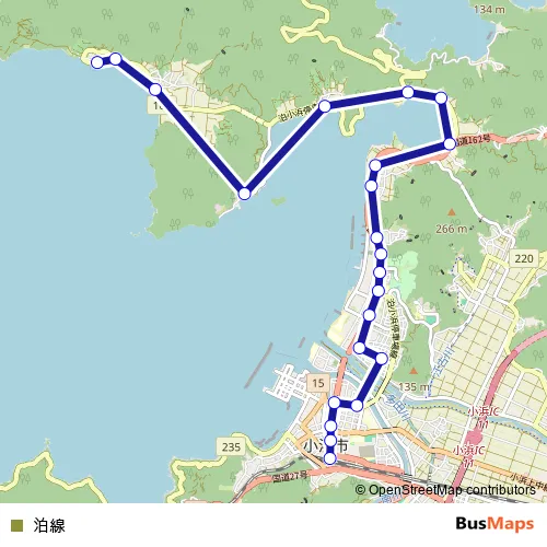 The first stop of the トマリセン bus route is オバマエキ and the last stop is