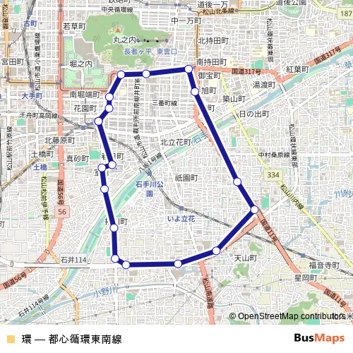 The first stop of the 環 bus route is 松山市駅 and the last stop is 松山市駅. 環 (都心循環東南線) is operational during 毎日.