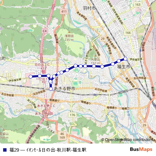 The first stop of the 福29 bus route is イオンモール日の出 and the last stop is 福生駅. 福29 (イオンモール日の出-秋川駅-福生駅) is operational during 毎日.