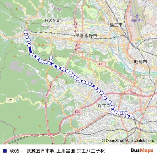 The first stop of the 秋05 bus route is 京王八王子駅 and the last stop is 武蔵五日市駅. 秋05 (武蔵五日市駅-上川霊園-京王八王子駅) is operational during 毎日.