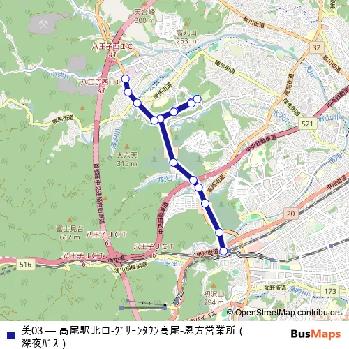 Click here to view the nearest 美03 - 高尾駅北口-グリーンタウン高尾-恩方営業所(深夜バス) bus stop.