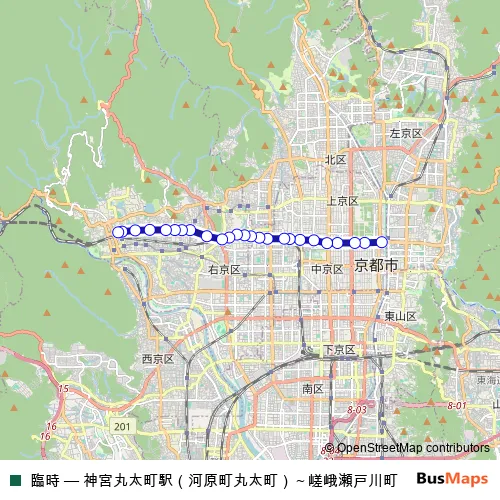The first stop of the 臨時 bus route is 河原町丸太町 and the last stop is 嵯峨瀬戸川町. 臨時 (神宮丸太町駅(河原町丸太町)~嵯峨瀬戸川町) is operational during 毎日.