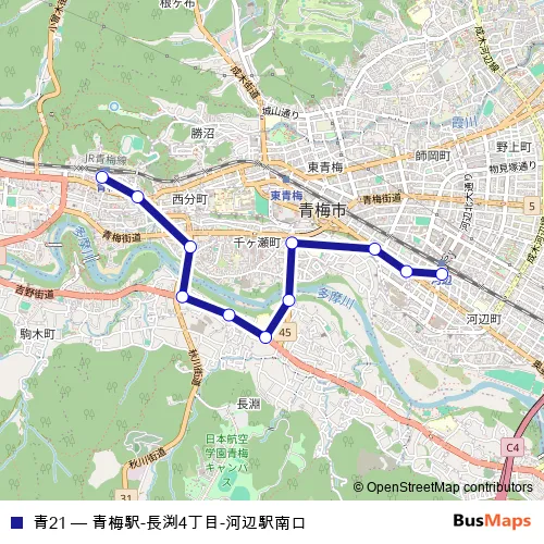 The first stop of the 青21 bus route is 河辺駅南口 and the last stop is 青梅駅. 青21 (青梅駅-長渕4丁目-河辺駅南口) is operational during 毎日.