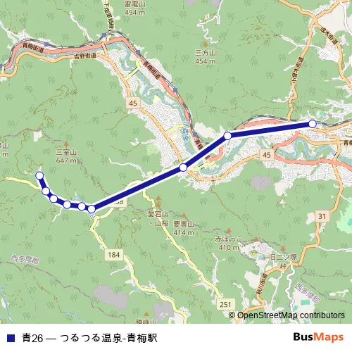 The first stop of the 青26 bus route is 青梅駅 and the last stop is つるつる温泉. 青26 (つるつる温泉-青梅駅) is operational during 週末.