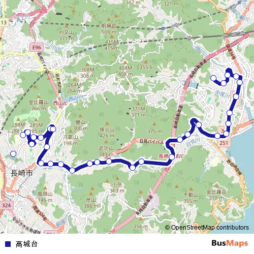 The first stop of the 高城台 bus route is 長崎東高発 and the last stop is