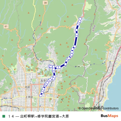The first stop of the 14 bus route is 出町柳駅前 and the last stop is 大原. 14 (出町柳駅→修学院離宮道→大原) is operational during 毎日.