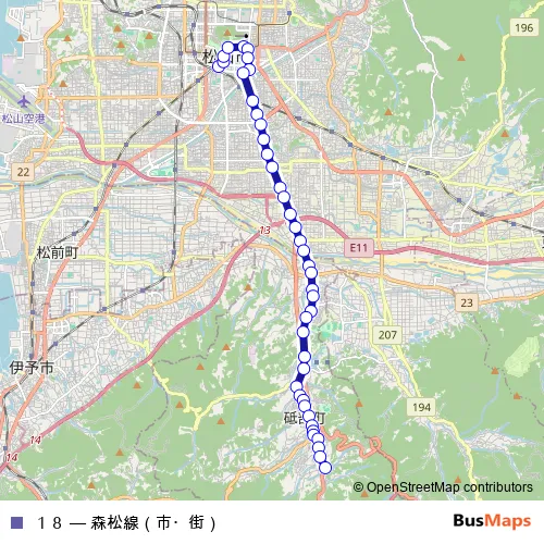 The first stop of the 18 bus route is 松山市駅 and the last stop is