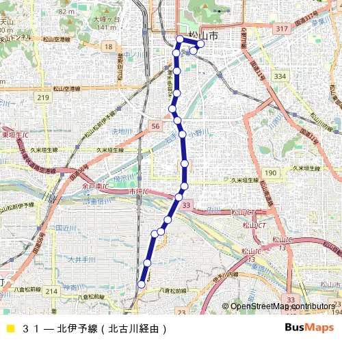 The first stop of the 31 bus route is 北伊予駅前 and the last stop is 松山市駅. 31 (北伊予線(北古川経由)) is operational during 毎日.