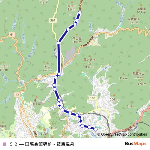 The first stop of the 52 bus route is 鞍馬温泉 and the last stop is 国際会館駅前. 52 (国際会館駅前~鞍馬温泉) is operational during 毎日.