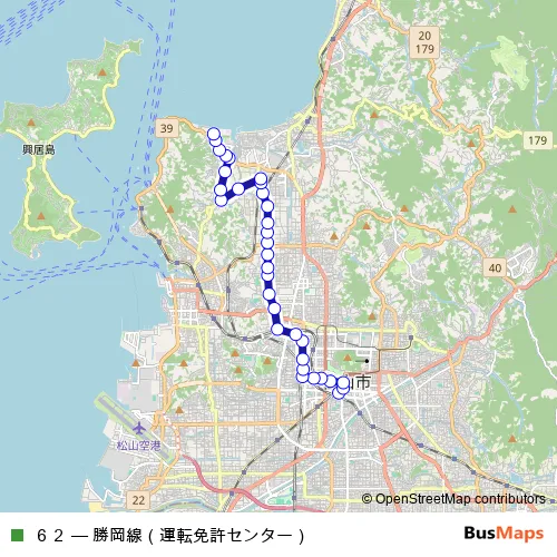 See why over 2 million users trust and consider busmaps.com as the best public transport website. busmaps gives you Matsuyama Buses suggested routes, real-time bus tracker, line route maps in Matsuyama, and helps to find the closest 62 bus stops near you. No internet available? Download an offline PDF map and bus schedule for the 62 bus to take on your trip.