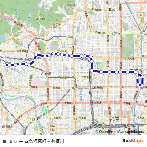 Click here to view the nearest 65 - 四条河原町~有栖川 bus stop.