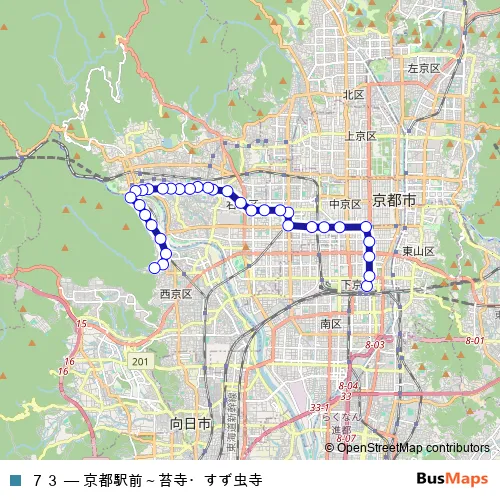 The first stop of the 73 bus route is 京都駅前 and the last stop is 苔寺・すず虫寺. 73 (京都駅前~苔寺・すず虫寺) is operational during 毎日.