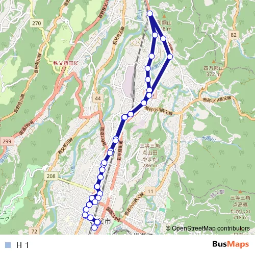 The first stop of the H1 bus route is 西武秩父駅 and the last stop is