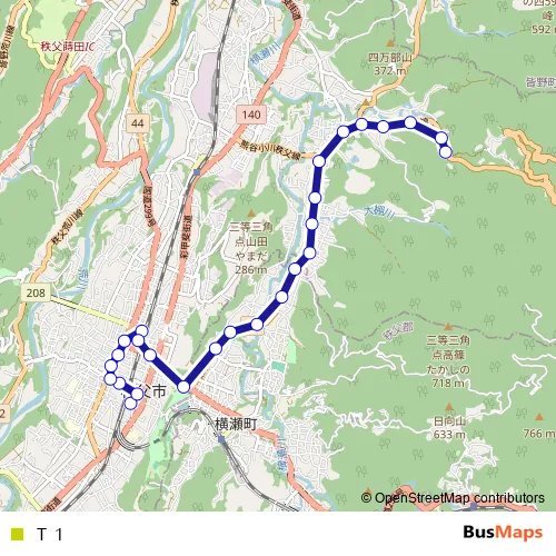 The first stop of the T1 bus route is 西武秩父駅 and the last stop is