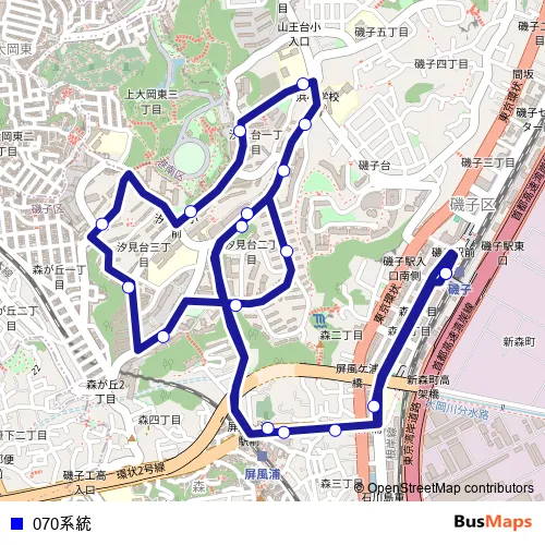 The first stop of the 070系統 bus route is 磯子駅前 and the last stop is