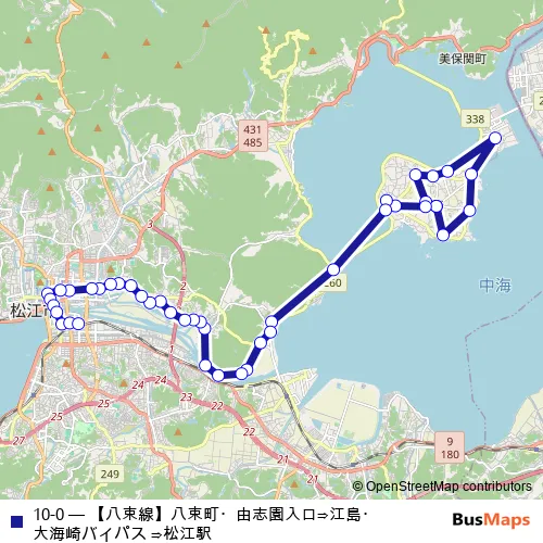 The first stop of the 10-0 bus route is 八束町・由志園入口 and the last stop is 松江駅. 10-0 (【八束線】八束町・由志園入口⇒江島・大海崎バイパス ⇒松江駅) is operational during 毎日.