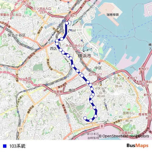 See why over 2 million users trust and consider busmaps.com as the best public transport website. busmaps gives you Yokohama Buses suggested routes, real-time bus tracker, line route maps in Yokohama, and helps to find the closest 103系統 bus stops near you. No internet available? Download an offline PDF map and bus schedule for the 103系統 bus to take on your trip.