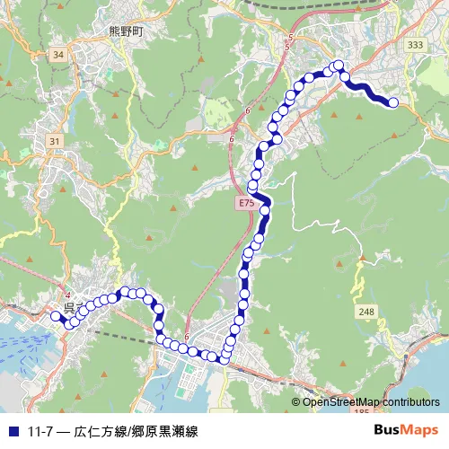 The first stop of the 11-7 bus route is 呉駅前 and the last stop is 広島国際大学. 11-7 (広仁方線/郷原黒瀬線) is operational during 毎日.