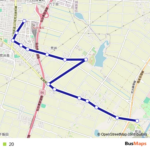 The first stop of the 20 bus route is 荒井駅 and the last stop is 震災遺構仙台市立荒浜小学校前. 20 is operational during 毎日.