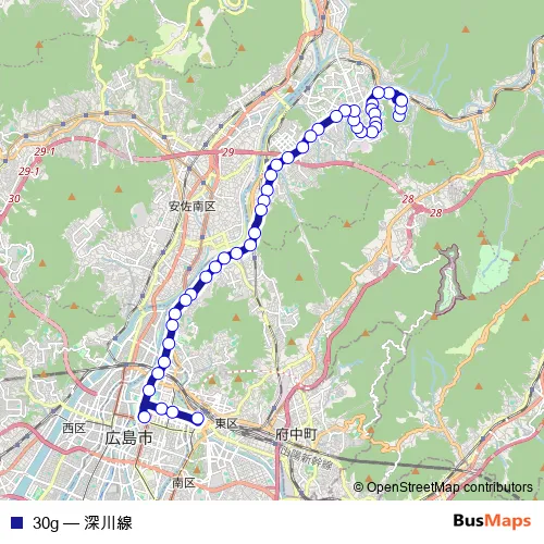 The first stop of the 30g bus route is 深川台 and the last stop is 広島駅. 30g (深川線) is operational during 毎日.