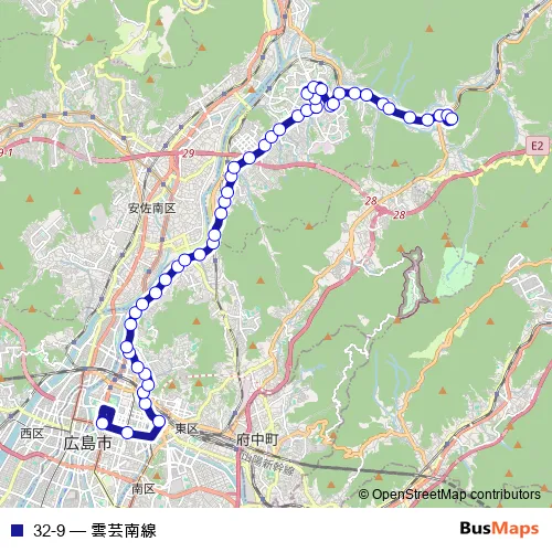 See why over 2 million users trust and consider busmaps.com as the best public transport website. busmaps gives you Hiroshima Buses suggested routes, real-time bus tracker, line route maps in Hiroshima, and helps to find the closest 32-9 bus stops near you. No internet available? Download an offline PDF map and bus schedule for the 32-9 bus to take on your trip.