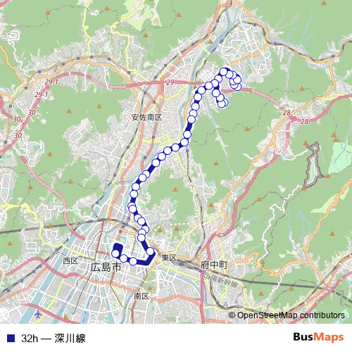 The first stop of the 32h bus route is 高陽台 and the last stop is 広島バスセンター. 32h (深川線) is operational during 毎日.