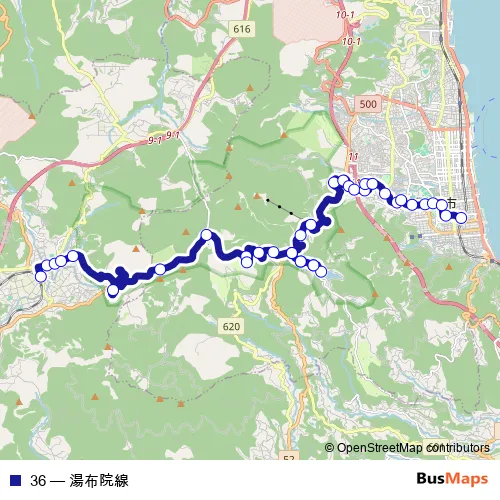 The first stop of the 36 bus route is 由布院駅前バスセンター and the last stop is 別府駅西口. 36 (湯布院線) is operational during 毎日.