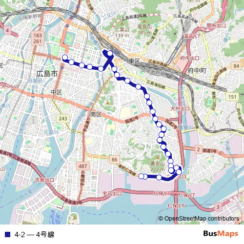 See why over 2 million users trust and consider busmaps.com as the best public transport website. busmaps gives you Hiroshima Buses suggested routes, real-time bus tracker, line route maps in Hiroshima, and helps to find the closest 4-2 bus stops near you. No internet available? Download an offline PDF map and bus schedule for the 4-2 bus to take on your trip.