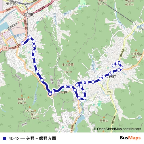 The first stop of the 40-12 bus route is 矢野駅前 and the last stop is 熊野萩原車庫前. 40-12 (矢野~熊野方面) is operational during 毎日.
