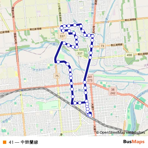 The first stop of the 41 bus route is おびひろえきばすたーみなる and the last stop is おびひろえきばすたーみなる. 41 (中鈴蘭線) is operational during 毎日.
