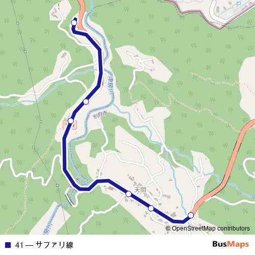 The first stop of the 41 bus route is 上天間 and the last stop is 仙人田. 41 (サファリ線) is operational during 平日.