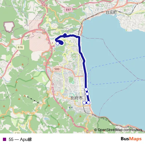 The first stop of the 55 bus route is 別府駅前 and the last stop is 立命館アジア太平洋大学. 55 (Apu線) is operational during 平日.