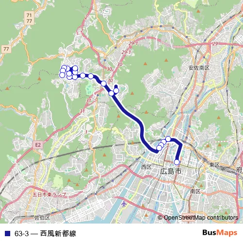 See why over 2 million users trust and consider busmaps.com as the best public transport website. busmaps gives you Hiroshima Buses suggested routes, real-time bus tracker, line route maps in Hiroshima, and helps to find the closest 63-3 bus stops near you. No internet available? Download an offline PDF map and bus schedule for the 63-3 bus to take on your trip.