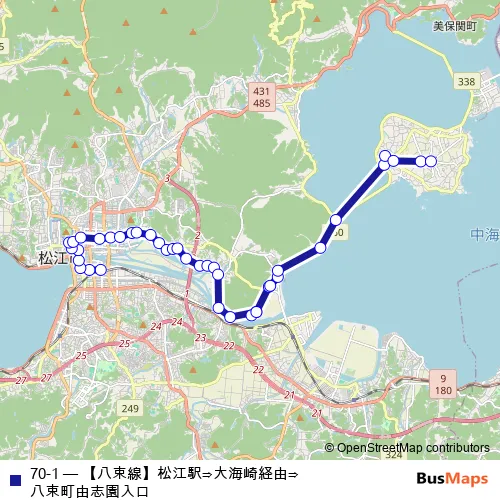 The first stop of the 70-1 bus route is 松江駅 and the last stop is 八束町・由志園入口. 70-1 (【八束線】松江駅⇒大海崎経由⇒八束町由志園入口) is operational during 毎日.