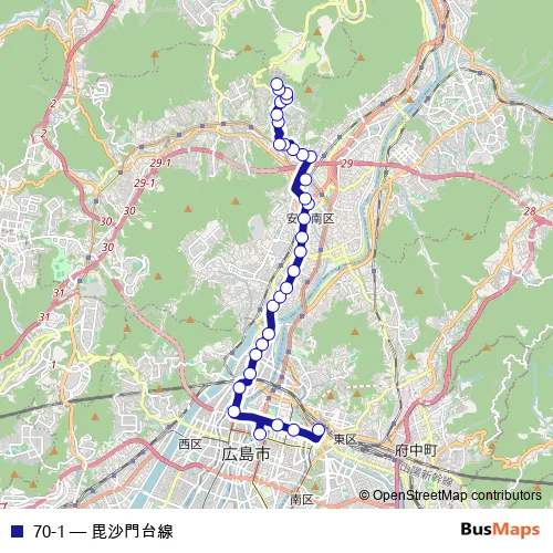 See why over 2 million users trust and consider busmaps.com as the best public transport website. busmaps gives you Hiroshima Buses suggested routes, real-time bus tracker, line route maps in Hiroshima, and helps to find the closest 70-1 bus stops near you. No internet available? Download an offline PDF map and bus schedule for the 70-1 bus to take on your trip.