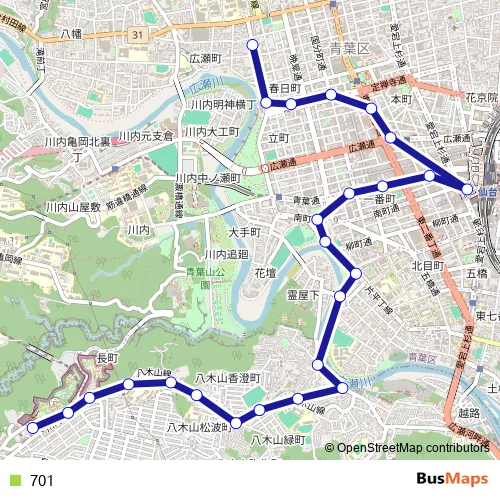The first stop of the 701 bus route is 交通局東北大学病院前 and the last stop is 八木山動物公園駅. 701 is operational during 毎日.